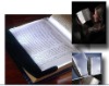 very light portable reading magic light. Every lights' weight is 300gor 150 g and the size is 235 x 171mmor 170x140mm 12v and 110 w 1) very convenient, very light, it only 260g .you can bring it in the room, outside, travel. the comfortable ,soft light will protect your eyes. 2)you can use it at night, accomodate the light depend on your demand, and not affect to others sleep 3) just three 7# buttom cell ,it will last nearly 30 hours. 4) it also can be a bookmark, wherever you read this time, you can find it easily next time.